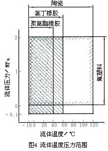 | (1) 襯里材料(或直接與介質(zhì)接觸的測(cè)量管) 常用襯里材料有氟塑料、聚氨酯橡膠、氯丁橡膠和陶瓷等。近年有采用高純氧化鋁999.7%AI2O3)陶瓷制成襯里的,但只限中小口徑傳感器。 氯丁橡膠和玻璃鋼用于非腐蝕性或弱腐蝕性液體,如工業(yè)用水、廢污水及弱酸堿,價(jià)格*為低廉。氟塑料具有優(yōu)良的耐化學(xué)腐蝕性,但耐磨性差,不能用于測(cè)量礦漿液。氟塑料中*早應(yīng)用的是聚四氟乙烯,因與測(cè)量管間僅靠壓貼,無(wú)粘結(jié)力,不能用于負(fù)壓管道,后開發(fā)各種改性品種,實(shí)現(xiàn)注塑成形,與測(cè)量管有較強(qiáng)結(jié)合力,可用于負(fù)壓, 聚氨酯橡膠有極好的耐磨耗性,但耐酸堿的腐蝕性較差。它的耐磨性相當(dāng)于天然橡膠的10倍,適用于煤漿、礦漿等;介質(zhì)溫度要低于40~60/70℃。氧化鋁陶瓷有極好的耐磨耗性和對(duì)強(qiáng)酸堿的耐磨腐蝕性,耐磨性約為聚氨酯橡膠的10倍,適用于具有腐蝕性的礦漿;但性脆,安裝夾緊時(shí)疏忽易碎,可用于較高溫度(120~140/180℃)但要防止溫度劇變,如通蒸汽**,一般溫度突變不能大于100℃,升溫150℃ 要有10min時(shí)間。 通用型EMF幾種材料的壓力溫度大體適用范圍可參閱圖4。 | |